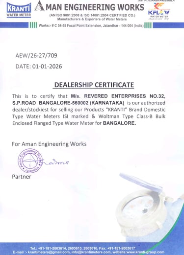 As an Authorized Distributor of Kranti in Bengaluru, Revered Enterprises provides a single-window solution for all your metering and valve requirements. We maintain a large local inventory of Kranti Water Meters, including the KBM-G Series for domestic use and the Woltman Type Bulk Meters for high-volume industrial flow. Simultaneously, we supply the complete range of Kranti Valves, such as Cast Iron Ball Valves (PV-405/406), Butterfly Valves, and Wafer Check Valves (PV-415) designed for seamless integration into water distribution networks. Our partnership ensures you receive 100% genuine, factory-tested products with full technical support, local warranty assistance, and rapid delivery to project sites throughout Bangalore.